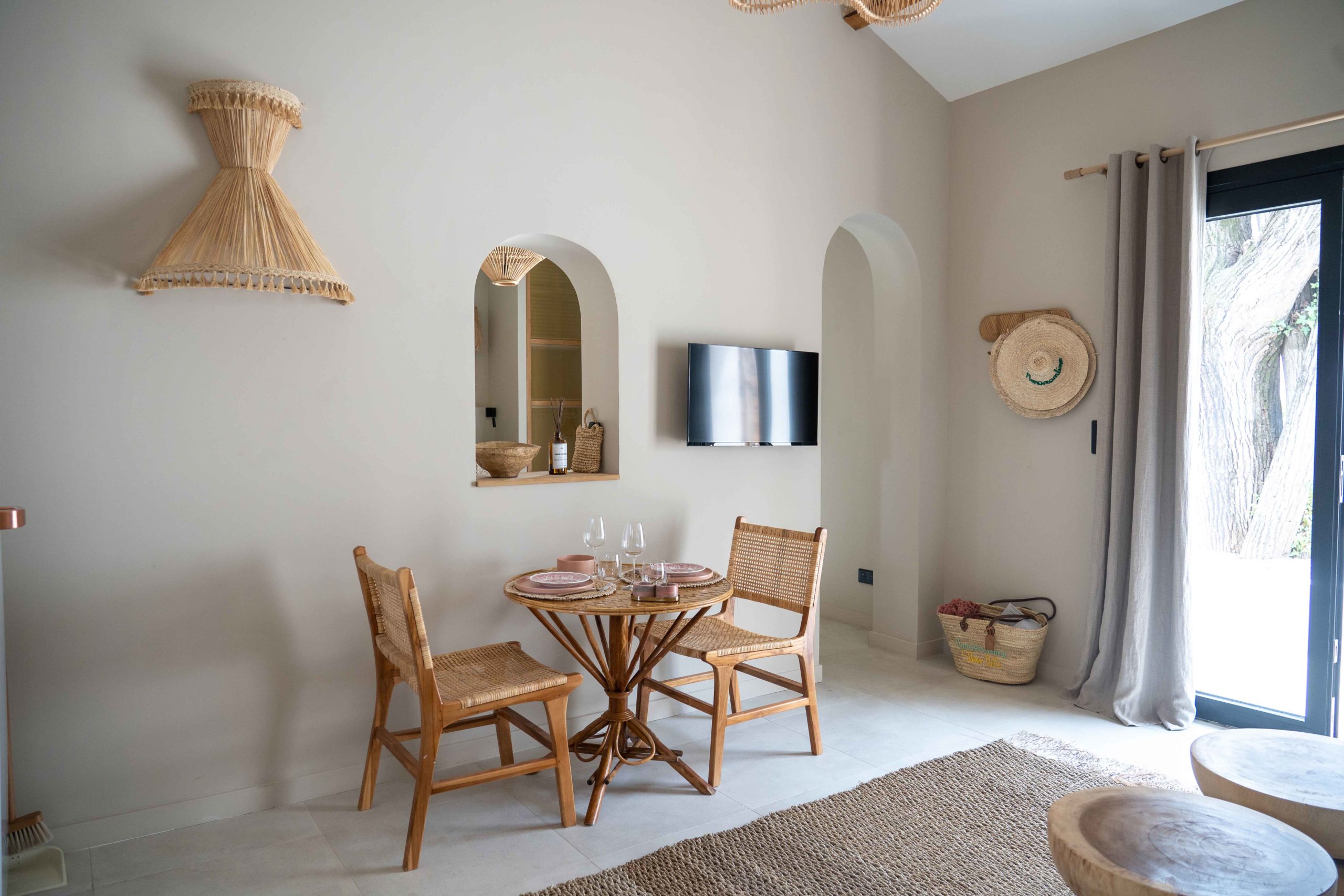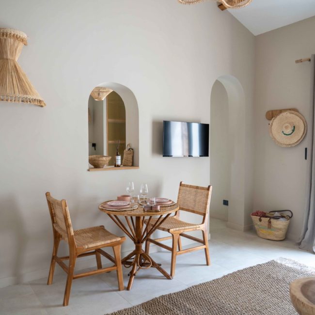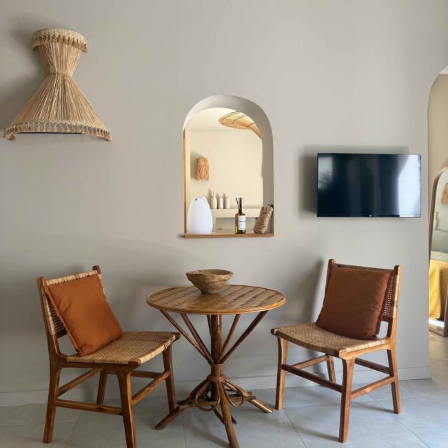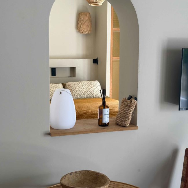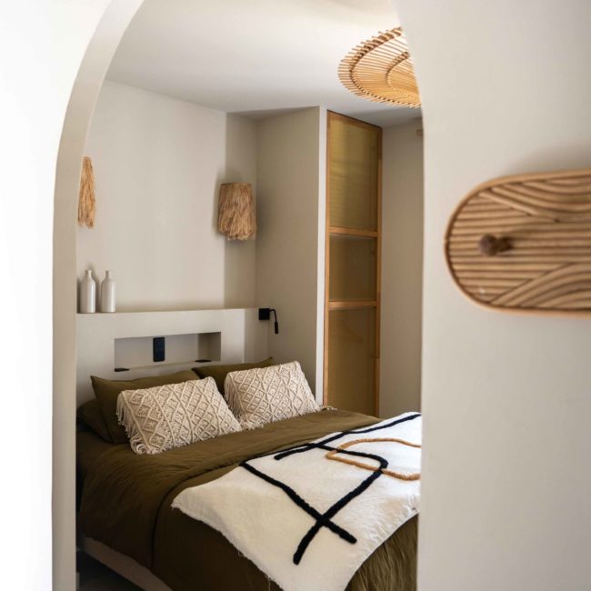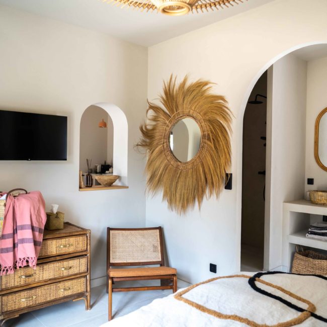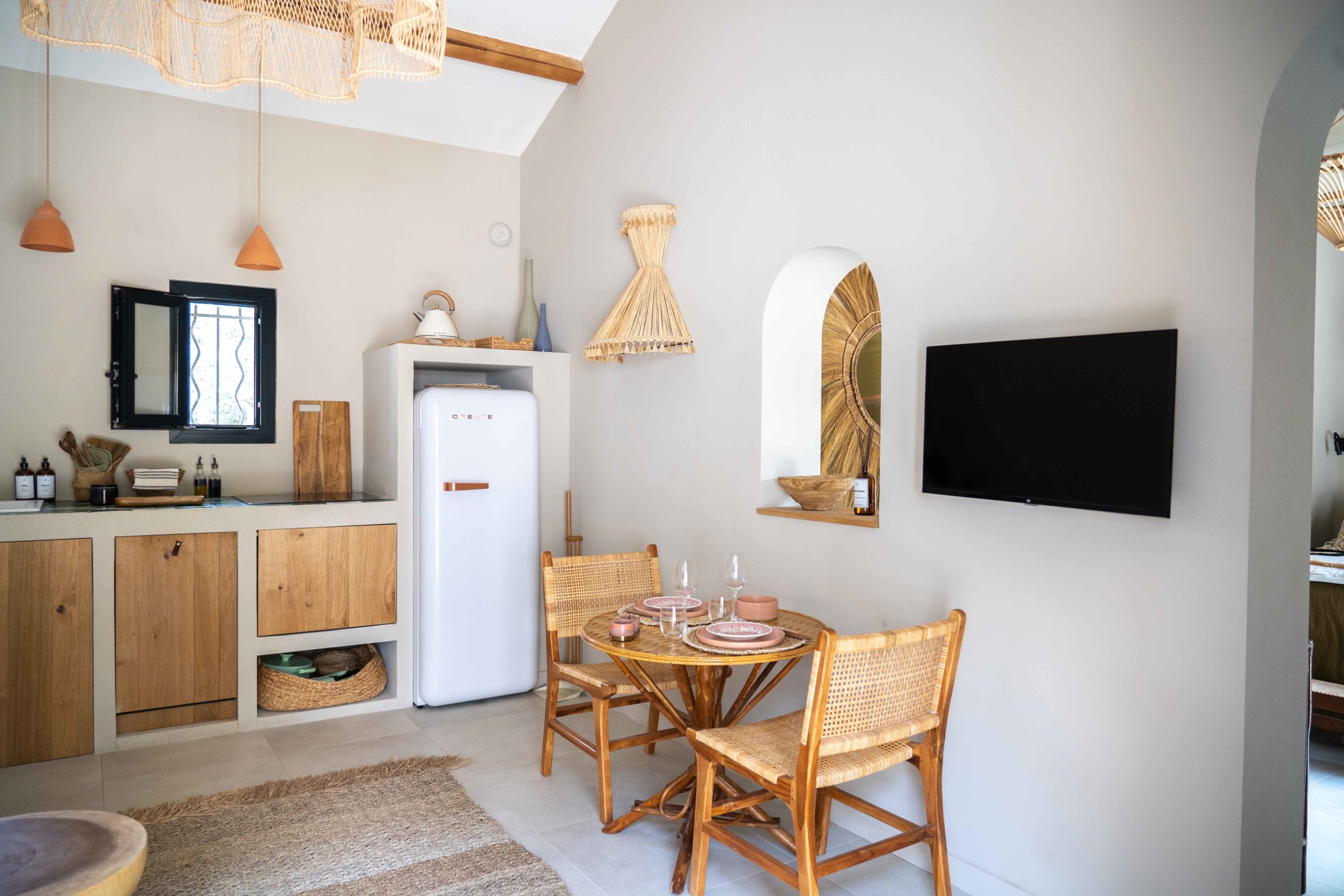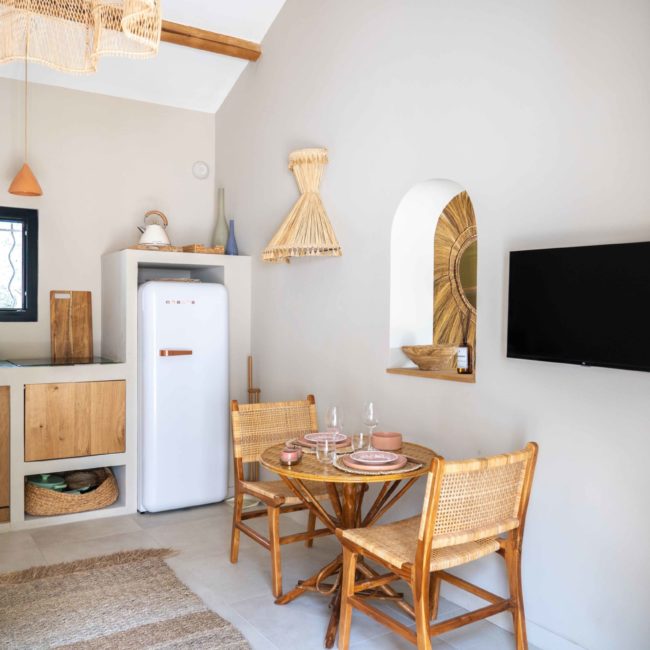 Epuré, l’intérieur vous invite au repos. Un salon cuisine, une chambre à la palette chromatique naturelle, un mobilier bohème vous permettent d’être comme chez vous mais ailleurs