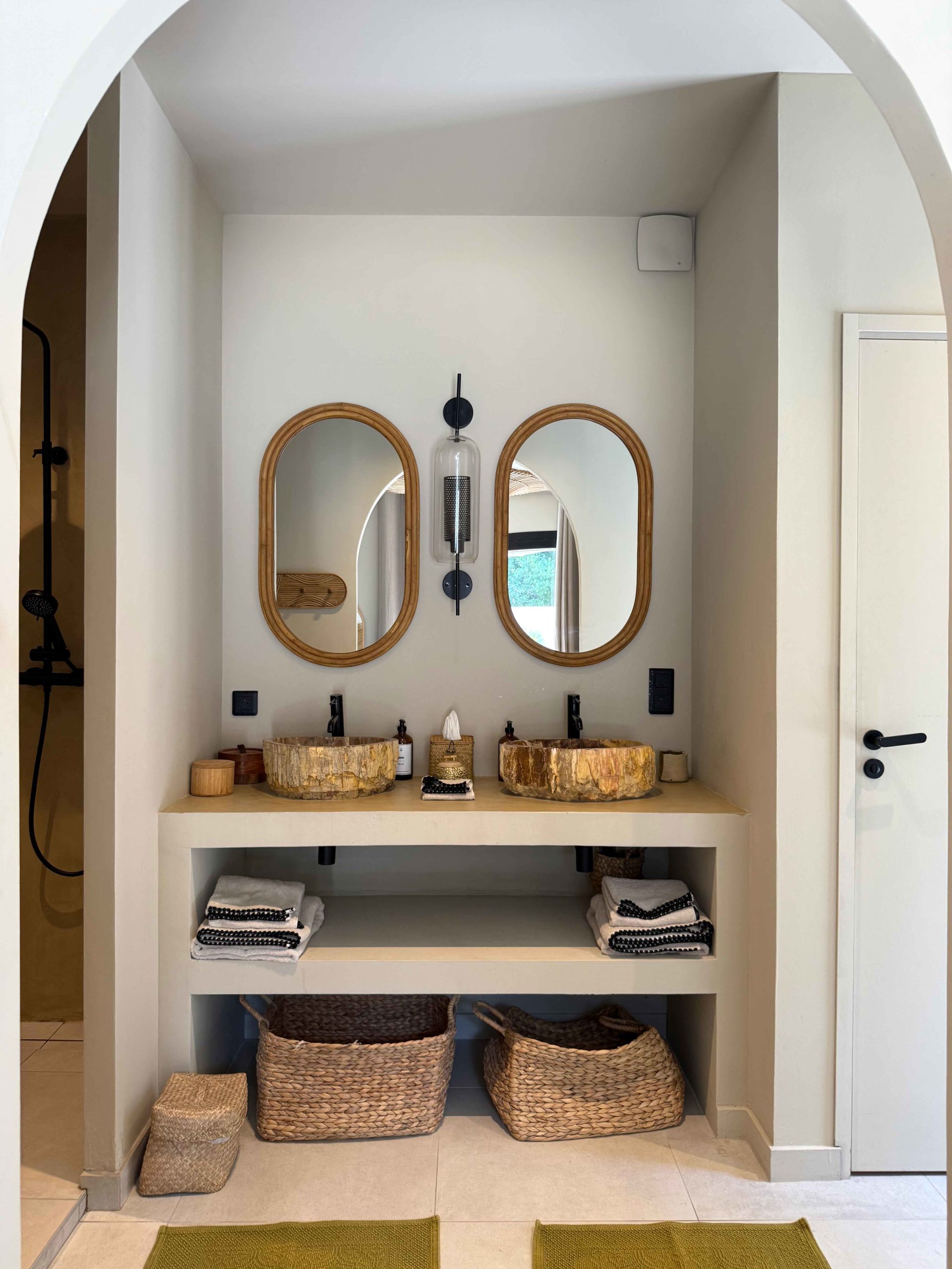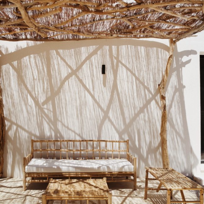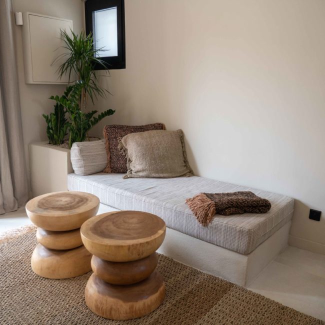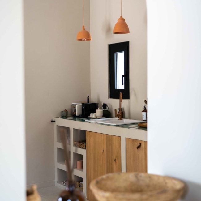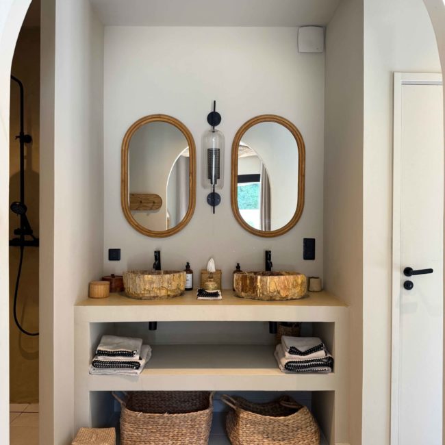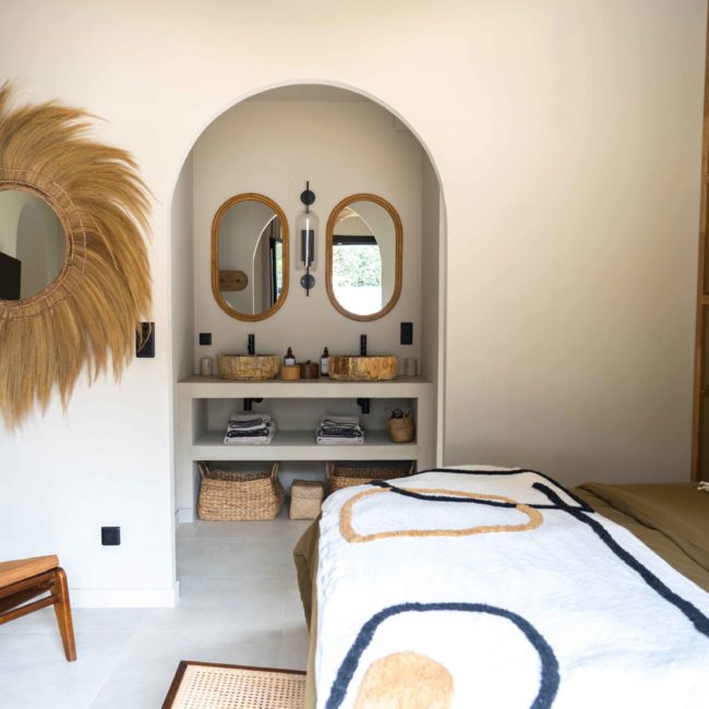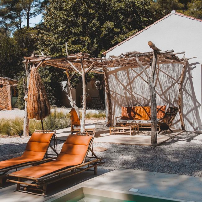 Une fois la porte en bois ouverte, un chemin vous emmène vers votre villa en parfaite harmonie avec la végétation. Votre piscine adossée à une petite cabane aux murs de pierres sèches et entourée de romarin et de stipas. Vous pouvez à loisir vous reposer dans le fauteuil suspendu pour lire à l’ombre d’un majestueux arboursier.